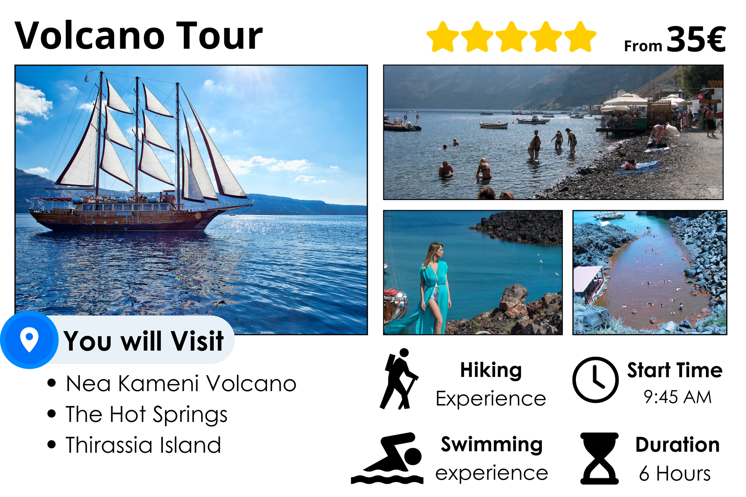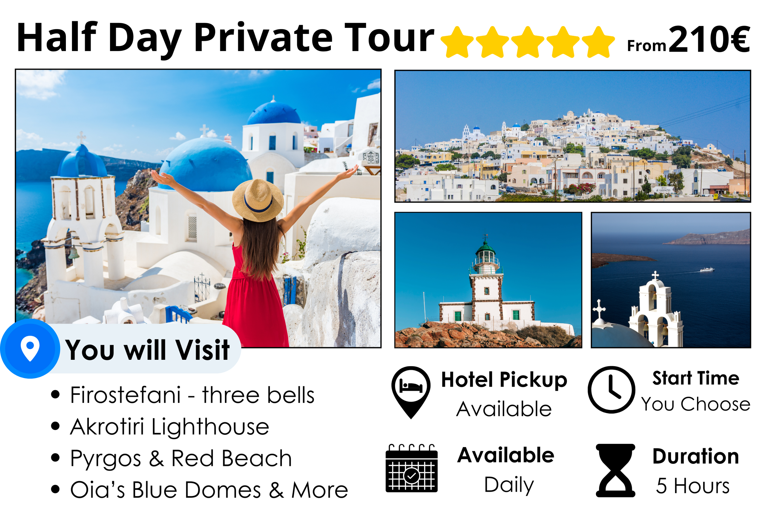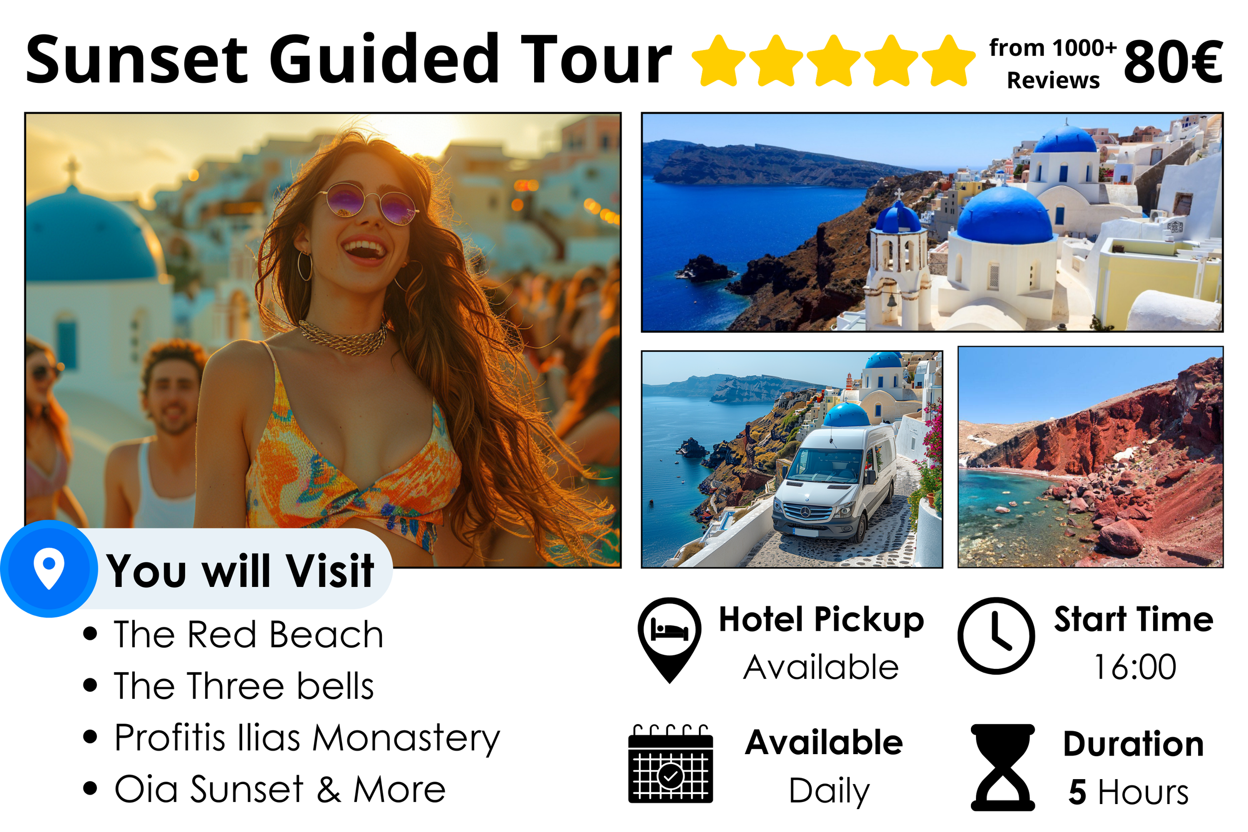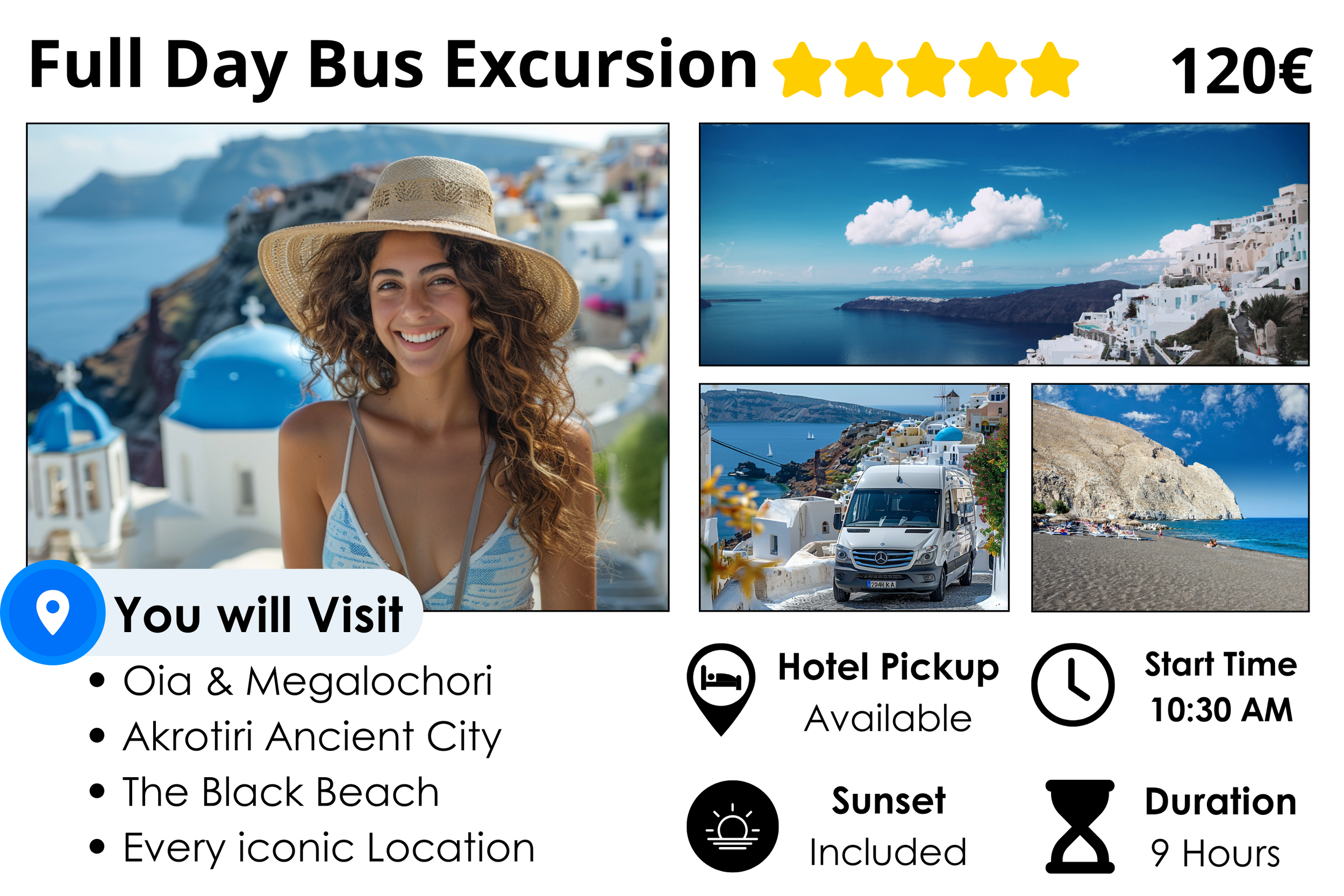 Choose your destinations: charming villages, historic sites, volcanic beaches, and more. Make your Santorini dreams come true!